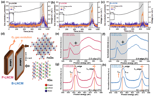 a) U-LNCM、b) P-LNCM和c) B- LNCM在1C下充电到4.8V时的DEMS图;d) P-LNCM和B– LNCM的循环稳定性示意图;e) P-LNCM和f) B-LNCM的sXAS 的O K-edge FY模式光谱;g) P-LNCM和h) B-LNCM的sXAS Ni L-edge FY模式光谱。