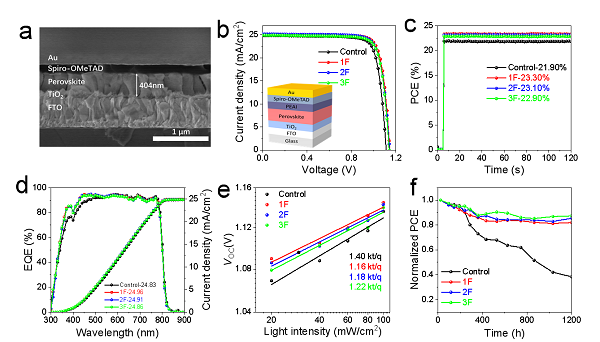 a) 截面SEM图像 b) J-V曲线 c) 最大功率点下的稳定输出功率 d)EQE图谱 e) 开压随光强变化图谱 f) 未封装的电池在相对湿度为10-20%,温度为15-25°C下的环境稳定性。