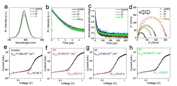 a) 钙钛矿薄膜的荧光图谱 b) 时间分辨荧光图谱 c) 瞬态光电压图谱 d) 电化学阻抗谱 e-h) 不同添加剂修饰钙钛矿的暗态I-V曲线