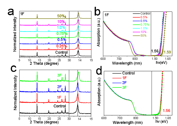 a) 不同1FEA添加量的XRD图谱 b) 不同1FEA添加量的紫外可见吸收光谱 c) 不同添加剂的XRD图谱 d) 不同添加剂的紫外可见吸收光谱