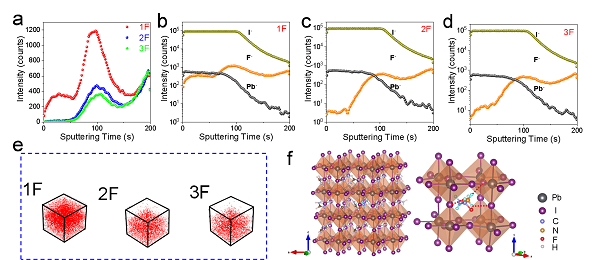 a) 不同添加剂钙钛矿薄膜的F元素分布图 b) 1FEA修饰的钙钛矿薄膜中F、Pb、I元素的分布图 c) 2FEA修饰的钙钛矿薄膜中F、Pb、I元素的分布图 d) 3FEA修饰的钙钛矿薄膜中F、Pb、I元素的分布图 e) F元素分布的3D展示 f) FEA在钙钛矿薄膜中的示意图