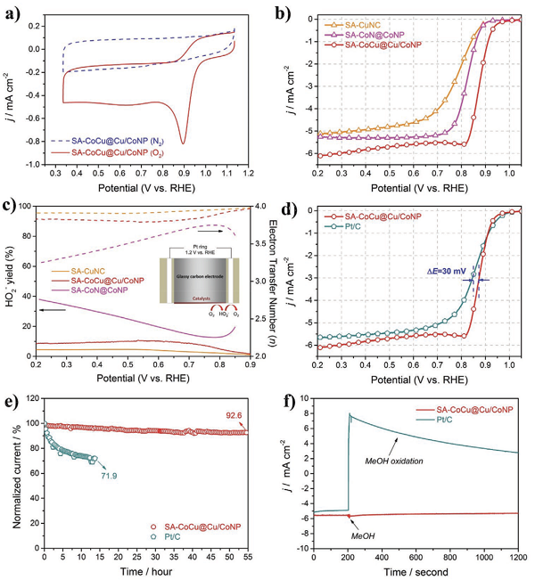 图3. a) 负载了钴铜多组分催化剂的玻碳电极在氧气饱和(实线)及氮气饱和(虚线)的0.1 M KOH溶液中的CV曲线。b) 负载了钴铜多组分催化剂及其他对比样品(单原子掺杂的碳和钴单组份催化剂)的旋转圆盘电极在氧气饱和的0.1 M KOH溶液中的氧还原性能电化学极化曲线。c) 钴铜多组分催化剂及其他对比样品(单原子掺杂的碳和钴单组份催化剂)基于旋转环盘电极的过氧化氢产物选择性曲线(实线)及反应过程中电子转移数曲线(虚线)。d) 负载了钴铜多组分催化剂及商用铂碳催化剂的旋转圆盘电极在氧气饱和的0.1 M KOH溶液中的氧还原性能电化学极化曲线。e) 钴铜多组分催化剂及商用铂碳催化剂在0.1 M KOH溶液中的氧还原稳定性测试图。f) 钴铜多组分催化剂及商用铂碳催化剂在电化学氧还原过程中甲醇耐受性测试。