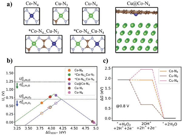 图4. a) 理论计算过程中所使用的不同催化活性位点的结构模型。其中碳原子、氮原子、钴原子、铜原子为棕色、淡蓝色、深蓝色及绿色小球。b) 不同反应活性位点处四电子(图中上部)及二电子(图中下部)反应路径的火山图。其中理论限制电位与反应中间产物OOH的吸附自由能呈函数关系。c) 过氧化氢反应副产物在钴及铜单原子处的二电子还原路径自由能曲线(电压:0.8 V)。