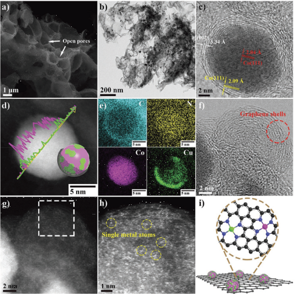 图1. 钴铜多组分催化剂的a) SEM, b) TEM和c) HR-TEM图片。钴铜多组分催化剂的d) HAADF-STEM图片及e)相关的EDS元素分布图。图d)中的箭头代表了铜(绿色)及钴(紫红色)两种元素沿箭头方向在纳米颗粒上的分布情况。其中图d)中的插图描绘了钴铜纳米颗粒的大致结构。 f) 催化剂中中空的石墨烯碳壳的HR-TEM图片以及g)HAADF-STEM图片。图h)是位于图g)中方框处的高倍HAADF-STEM图片,显示了大量呈单原子形态分布的钴、铜单原子位点(黄色圆圈处)。图i)为催化剂结构示意图,其中绿色、紫红色、蓝色及黑色分别代表铜、钴、氮和碳原子。