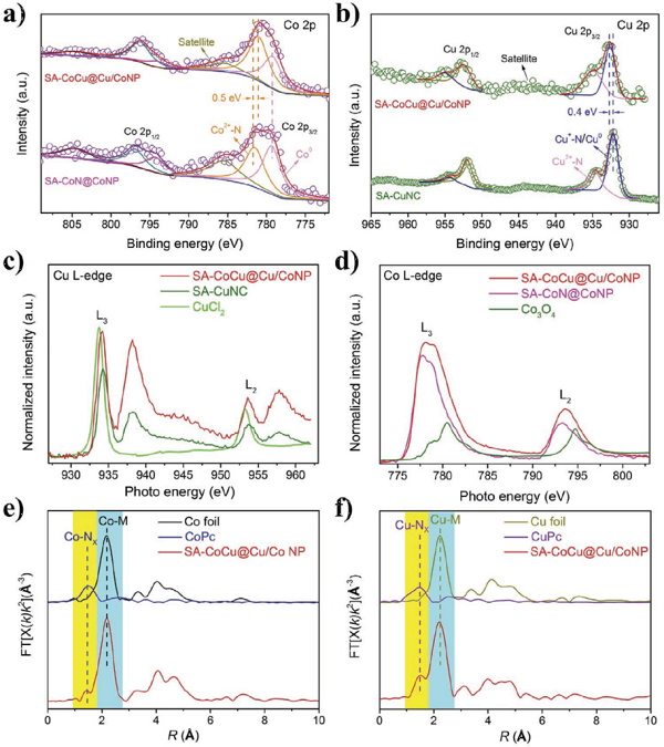 图2. 钴铜多组分催化剂及其他对比样品的高倍XPS a) Co 2p 及b) Cu 2p图谱。钴铜多组分催化剂及其他对比样品的同步辐射软X射线 c) Cu L-edge 及 d) Co L-edge吸收谱。钴铜多组分催化剂及其他对比样品的傅里叶转换后的EXAFS e) Co K-edge 和 f) Cu K-edge图谱。