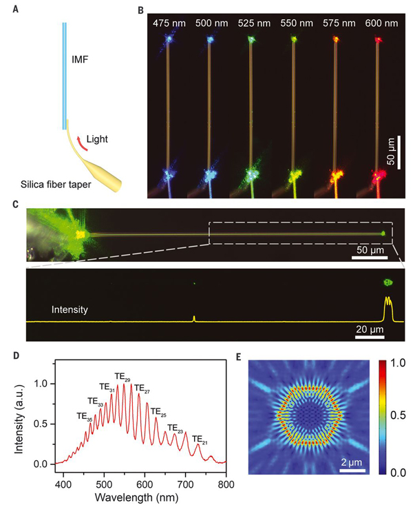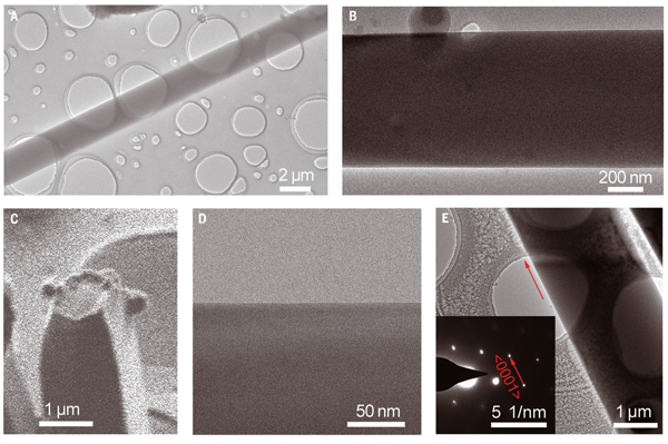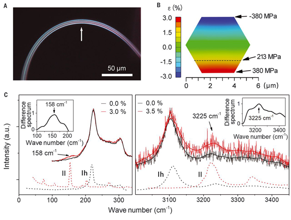 今日,在浙江大学童利民教授和郭欣副教授团队等人带领下,发现微纤维冰(IMFs)具有特殊的力学性能。通过采用电场增强的生长方法,其生长温度远低于以前使用的方法,成功地生长出高质量和小直径(低至数百纳米)的IMFs。研究表明,生长的IMFs是六方单晶,其六方轴沿着核心,表面光滑,截面均匀。IMFs可以弯曲高达10.9%的应变,这比以前报道的最大应变要高得多,并且接近理论弹性极限(14至16.2%)。同时,对弯曲的IMFs进行了拉曼光谱测量,并在-70°C下3%的临界应变附近检测到了冰Ih和II之间的可逆相变。为了证明IMF具有良好的光学特性,证明了它们可以用低光损耗引导可见光,并在其圆周上支持回音壁模式(WGMs)。相关成果以题为“Elastic ice microfibers”发表在了Science。