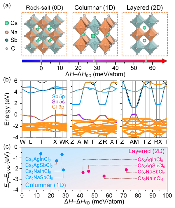 理论计算表明(图1),同种[BX6]八面体单元的排列从岩盐矿构型(零维)变成柱状(一维)和层状(二维)构型之后热力学稳定性变差,这解释了为什么在该工作之前报道的所有A2B(I)B(III)X6型双钙钛矿材料均是采用岩盐矿构型。以Cs2NaSbCl6为例,岩盐矿构型时带隙是 3.90 eV,其导带相对局域(带宽为2.02 eV)。而排列变成柱状和层状排列后导带沿着同种八面体的链或者层的方向变得非常分散(带宽分别为3.91和4.44 eV),使得计算的带隙急剧降低至1.77和1.20 eV。理论计算表明,再拓展到更多的元素组合时,同种八面体的排列方式变成柱状(一维)和层状(二维)构型时电子维度相应的也保持了这种1D和2D的电子维度。因此同种八面体的排列方式的调节是一种有效的策略来调节卤化物双钙钛矿的电子结构。