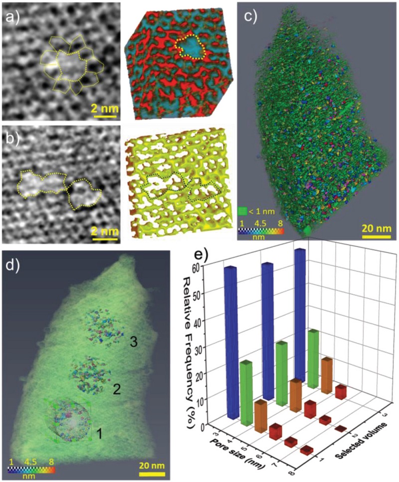 (a)通过合并几个微孔笼和沸石晶体中介孔和周围环境的3D,表示产生的介孔的高分辨率视图;