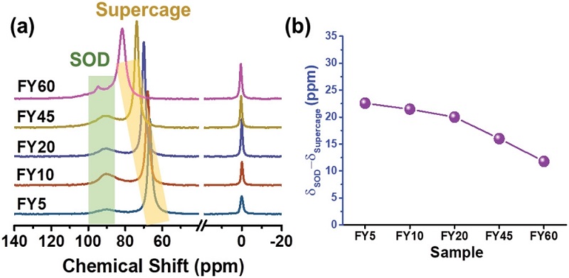 (b)SOD笼和分级沸石中超笼中与Xe相关的峰之间的化学位移差异。