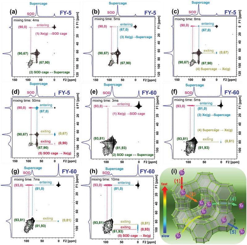 (a-d)在温度为253 K,混合时间为4、5、8、50 ms下,Xe在FY5沸石上的HP 129Xe EXSY NMR光谱;