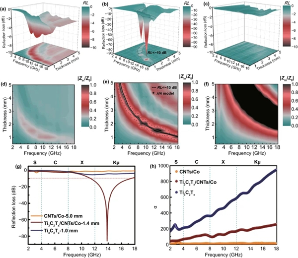 (d-f)Ti3C2Tx、Ti3C2Tx/CNTs/Co和CNTs/Co的相对输入阻抗模量(|Zin/Z0|)图;