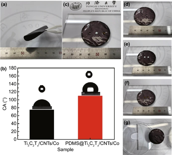 (b)Ti3C2Tx/CNTs/Co薄膜和PDMS@Ti3C2Tx/CNTs/Co薄膜的接触角;