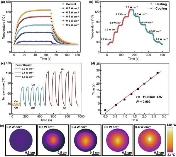 (a)在不同NIR激光功率密度下,PDMS@Ti3C2Tx/CNTs/Co薄膜的光热加热和冷却曲线;