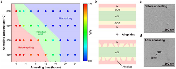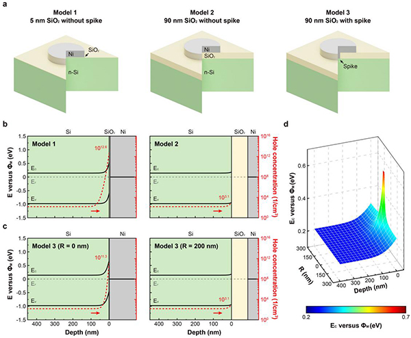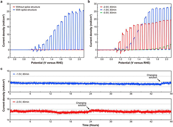 近日, 美国得克萨斯大学奥斯汀分校Edward T. Yu和Li Ji(通讯作者)展示了一种低成本且高度可扩展的策略,以制备高性能和稳定性好的Si基MIS光阳极,基于铝(Al)通过绝缘氧化物层的薄膜反应,然后是镍(Ni)电沉积,从而不需要任何光刻图案。研究表明,Al与SiO2或Si的薄膜反应导致 Al“尖峰”局部渗透到衬底材料下部,其导致具有Al接触金属化的硅pn结结构中的电短路。Al尖峰也可以通过绝缘层SiO2发生,并已被利用来通过Si上的氧化物钝化层形成欧姆接触。在以Al作为金属层的MIS光电极结构中,Al/SiO2/Si结构在300℃以上的退火会导致Al穿透SiO2并导致在MIS结构中形成局部金属尖峰。典型的尖峰密度为108-109 cm-2,能够非常有效地收集光生载流子。周围的氧化物区域保持电绝缘并保留其保护功能。在这项工作中,在通过SiO2形成局部铝尖峰之后,Al 被蚀刻并通过电沉积被Ni取代,Ni作为OER 催化剂。在电沉积过程中,Ni覆盖暴露的Si表面,导致分散的Ni在SiO2表面的相应位置生长。剩余暴露的厚SiO2和电沉积Ni在碱性水溶液中具有优异的耐腐蚀性。该过程形成具有高效率、长期稳定性、低成本和高可制造性的Si基MIS光阳极,而无需使用任何复杂且昂贵的光刻图案化技术。相关研究成果以“Scalable, highly stable Si-based metal-insulatorsemiconductor photoanodes for water oxidation fabricated using thin-film reactions and electrodeposition”为题发表在Nature Communication上。
