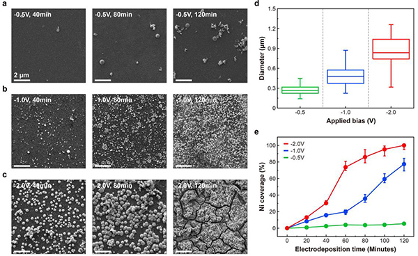 (e,f)在SiO2/Si表面上的Ni覆盖率与电沉积时间的函数关系。