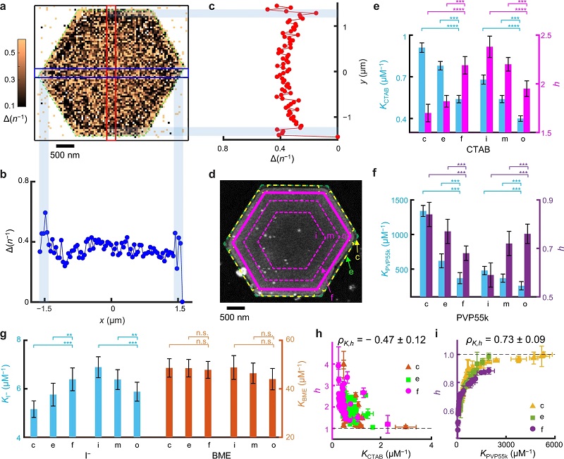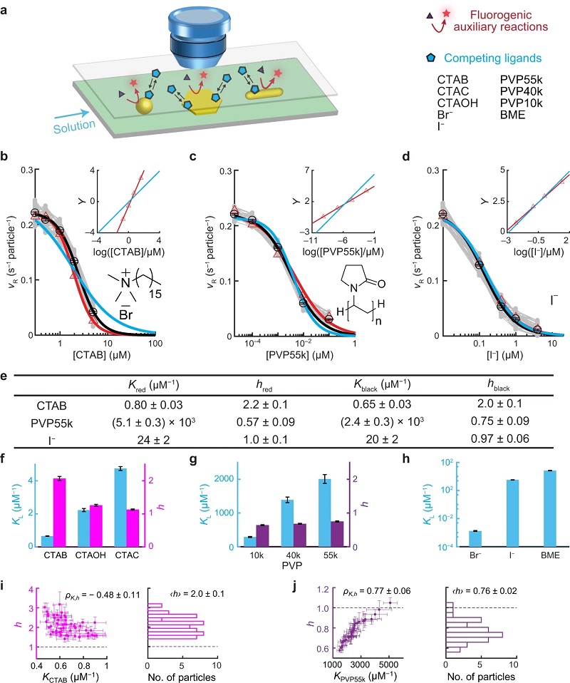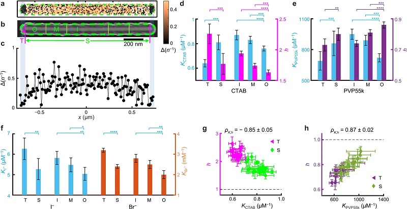 (d-f)在20、15、21和44个纳米棒上CTAB、PVP55k和I−&Br−的吸附亲和力(K)和协同性(h)的面和子面差异;