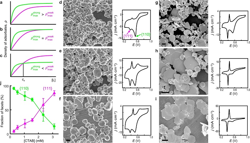 (d-i)左图:在增加[CTAB]时合成的Au纳米颗粒的SEM图像:0.26、0.52、1.04、1.56、2.34和3.12 mM。右:相应的欠电位铅沉积的CV。