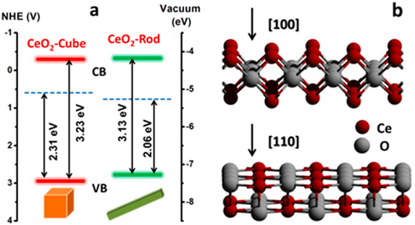 图7(a)不同二氧化铈纳米晶的能带结构,(b)不同晶面原子排列的平板模型。