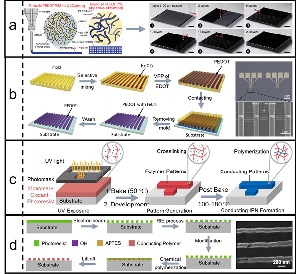 图 9. a)3D打印制备热电器件的示意图;b)liquid-bridge-mediated transfer moulding法制备热电器件示意图;c)紫外线刻蚀法制备热电器件示意图;d)电子束刻蚀法制备热电器件示意图。