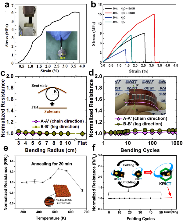 图10 a)通过张力测试得到PPBH/CNT/PUBI薄膜的应力-应变曲线;b)通过张力测试得到PPy/SWCNT薄膜的应力-应变曲线;c)FET模块的内阻随弯曲半径的变化曲线;d)FET模块的内阻随弯曲次数的变化曲线;e)Au-doped CNT/PANI薄膜器件的内阻随温度的变化曲线;f)该器件内阻随弯折次数的变化曲线。