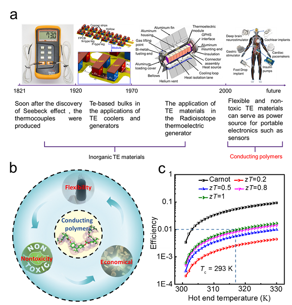 图 1. a) 热电材料的发展和应用; b) 柔性热电材料的优点;c) 理论能量效率和热电材料优值的关系