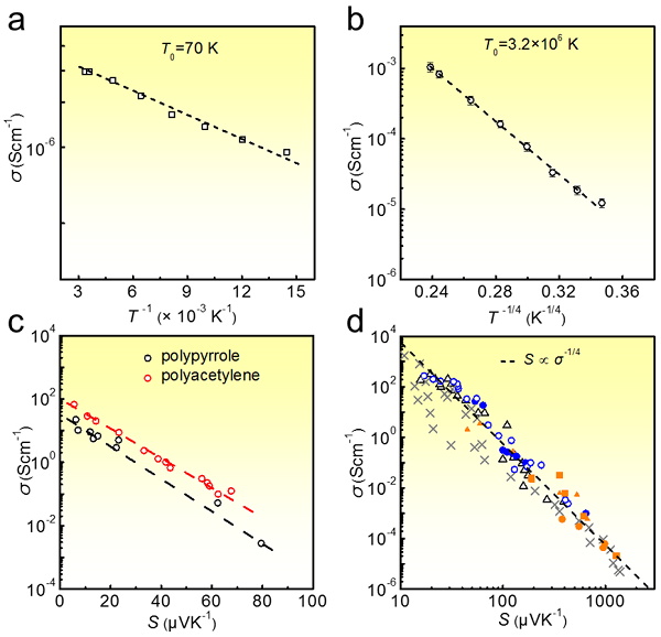 图 2. (a) 符合nearest neighbouring hopping model的电导率和温度关联; (b) 符合variable-range hopping model的电导率和温度关联;c) 符合mobility edge model的电导和塞贝克系数关联;d)符合transport edge model的电导和塞贝克系数关联。