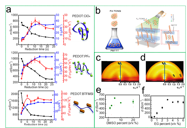 图 3. a)掺杂 ClO4, PF6和bis(trifluoromethylsulfonyl)imide (BTFMSI)的PEDOT:PSS薄膜的热电性能;b)导电聚合物的两种掺杂方式;c) 没有掺杂EG和 d)掺杂3%EG的PEDOT:PSS薄膜的二维 GIWAXD图;e)PEDOT:PSS薄膜的电导率与掺杂的DMSO浓度的关系;f)PEDOT:PSS薄膜的电导率与掺杂的EG浓度的关系。