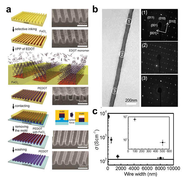 图 4. a) 制备单晶PEDOT纳米线的工艺流程示意图;b) PEDOT纳米线的TEM图像和衍射图谱 的;c) PEDOT纳米线电导率与线宽的关联。