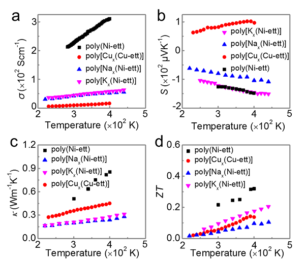 图 5. 四种金属元素络合聚合物的热电性质与温度的关联。a)电导率,b)塞贝克系数,c)热导率和d)ZT 。
