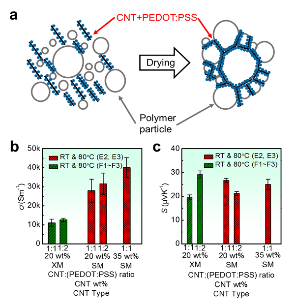 图 6. a) 碳纳米管在球型乳胶颗粒表面形成三维网状结构的示意图;PVAc/CNT/PEDOT:PSS复合物的 b)电导率和c)塞贝克系数。