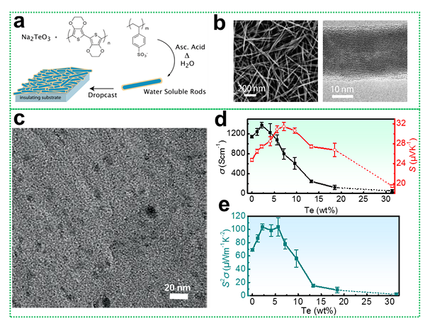 图 7. a)PEDOT:PSS/Te复合物原位合成法示意图;b)纳米Te棒的SEM和TEM图;c)PEDOT:DBSA/Cl-Te的HRTEM图;d)和e)PEDOT:DBSA/Cl-Te薄膜的热电性能不同掺杂单晶硒化锡块体的热电性能。