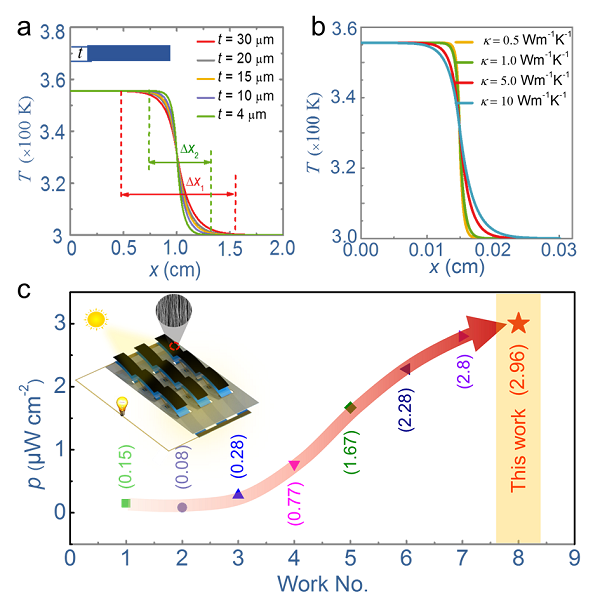 图 8. a)不同薄膜厚度t和 b)薄膜热导率κ条件下,薄膜长度方向上的温度分布曲线;c)最近几个代表性工作中报道的柔性器件输出功率密度比对图。