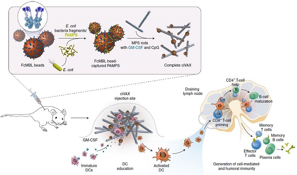 美国哈佛大学的David J. Mooney(通讯作者)团队报道了一种可注射生物材料疫苗(ciVAX PAMP),通过招募、重编和释放树突细胞可对细菌抗原产生强效的体液和T细胞反应。这一疫苗由吸附了粒细胞-巨噬细胞集落刺激因子(GM-CSF)和富含CpG的寡核苷酸的介孔二氧化硅(MPS)支架构成,该支架还集成了表面涂覆有广谱凝集素(FcMBL)的超顺磁性微珠,可用于磁性捕捉由灭活细菌胞壁衍生的溶菌产物的病原体相关的分子模式(PAMP)。研究发现,这一疫苗可以保护小鼠抵抗耐甲氧西林金黄色葡萄球菌的皮肤感染、致命大肠杆菌引发的感染性休克。作者认为,强大的免疫原性、较低的副作用发生率、模块化的制备过程等都使得这一新型疫苗技术非常适用于防止细菌性感染病。研究成果以题为“Biomaterial vaccines capturing pathogen-associated molecular patterns protect against bacterial infections and septic shock”发布在国际著名期刊Nature Biomedical Eneering上。
