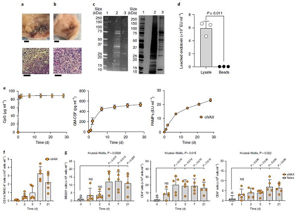 (a-d)PLG ciVAX通过将含有GM-CSF和CpG的PLG酸支架与被FcMBL磁珠捕捉的大肠杆菌RS218混合冷干形成;