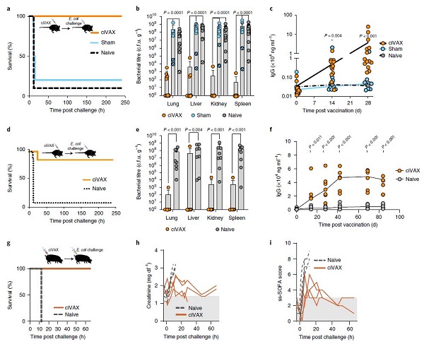 (g-i)ciVAX疫苗对猪模型进行接种治疗(大肠杆菌类型为多药耐药的41949),(g)存活率检测,(h)肌酐水平,(i)猪特异性SOFA。