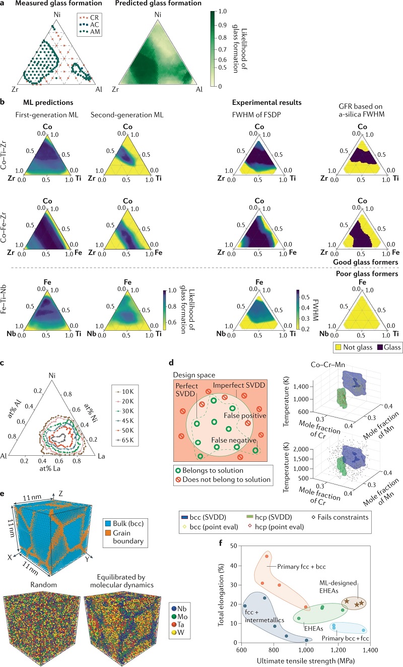 近日,美国杜克大学Stefano Curtarolo和美国杨百翰大学Gus L. W. Hart(共同通讯作者)等人报道了一篇关于机器学习(ML)在金属合金领域应用的最新综述。在文中,作者概述了与金属合金相关的ML概念、方法和结果:两种或多种物质的原子级混合物,其中至少一种是金属,混合物的整体特征是金属。首先,作者简要总结了模型-汉密尔顿式建筑和以数据为中心的材料科学的概念,然后概述了计算数据库、结构表示示例和搜索描述符的方法。其次,作者介绍了值得注意的研究,以及已经探索过的应用。包括金属玻璃、高熵合金、形状记忆合金、高温合金、催化合金和磁性合金。最后,作者讨论了冶金合金加工、机械性能(弹性、强度、延展性、硬度、韧性、堆垛层错、应力热点、疲劳和开裂、磨损和蠕变)和热性能的ML研究。其中,对半导体合金的许多类似ML的研究分析不属于本文的范围。研究成果以题为“Machine learning for alloys”发布在国际著名期刊Nature Reviews Materials上。