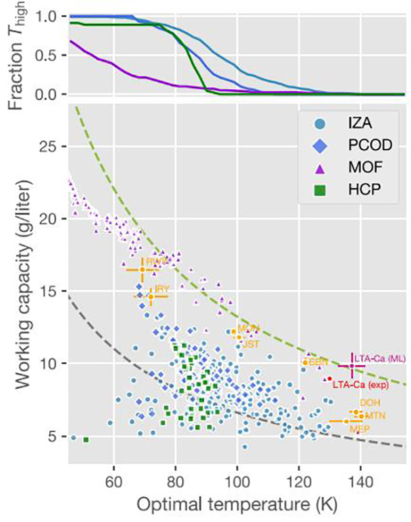 灰色虚线表示没有任何吸附剂材料的压缩氢气罐的工作容量,绿色线表示该值的两倍。突出显示和标记的点是沸石,报告了额外的验证模拟。