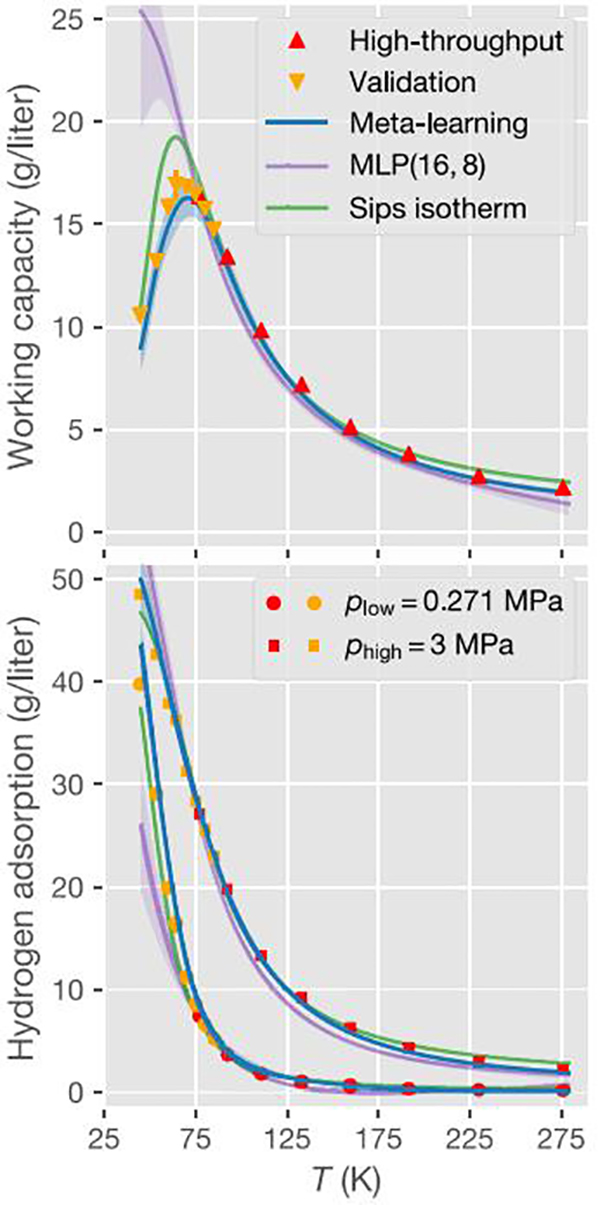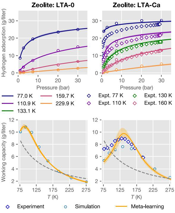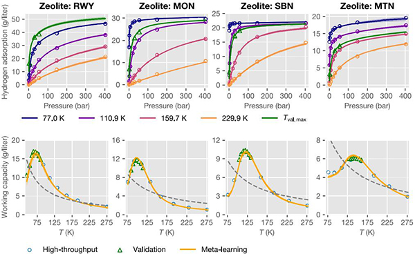 近日,美国明尼苏达大学J. Ilja Siepmann(通讯作者)描述了一种元学习方法,用于在单个机器学习模型中预测不同NPM的气体吸附与温度和压力的函数关系。本文使用从沸石、金属有机骨架和超交联聚合物的高通量蒙特卡罗模拟中获得的数据,开发了一种元学习模型,该模型可以同时预测多种材料在广泛的压力和温度范围内的吸附负载。与将模型分别拟合到每种材料相比,元学习提供了更高的准确性和改进的泛化能力,并且使我们能够在给定的压差下确定具有最高工作容量的最佳储氢温度。对于气体吸附的机器学习,本文的元学习方法完全基于NPM的吸附数据给出了 NPM的指纹。该模型直接将NPM的氢负载表面编码为指纹表示,从而稀疏的实验数据也可以用作输入。输入中没有结构或能量特性也使我们能够将相同或微调的模型应用于具有不同结构和化学性质的NPM。在已合成沸石的数据上训练的元学习模型能够推广到其他类型的NPM。同时,本文应用元学习方法来预测合成和假设全硅沸石、超交联聚合物 (HCP) 和MOF的最佳储氢温度。元学习模型生成的吸附指纹也显示出与高最佳温度和高工作能力相关的明显特征。最后,本文证明了通过模拟和元学习对阳离子交换沸石给出的预测最佳温度和储氢容量与实验结果非常吻合。本文的方法和结果为储氢材料的设计提供了新的指导方针,并提供了将机器学习纳入高通量材料发现的新途径。相关研究成果以“Fingerprinting diverse nanoporous materials for optimal hydrogen storage conditions using meta-learning”为题发表在Sci. Adv.上。