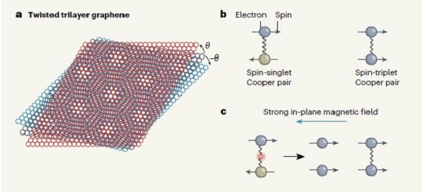 在过去的四年里,科学家们开始探索由堆叠但略微错位的石墨烯层组成的准二维系统——单片六边形排列的碳原子。这种系统迅速引起了人们的关注,因为它们可以通过实验轻松调整并拥有丰富多样的相关量子相。在扭曲的三层石墨烯中已经发现了超导性,其中包括三个堆叠的石墨烯层,其中顶层和底层相对于中间层分别以 θ 和-θ 的角度旋转(图 1)。通过调整 θ 的值,可以在从电子基本上彼此弱耦合的状态到它们强耦合的状态的范围内研究扭曲三层石墨烯的物理学。曹原等人发现,当 θ 等于大约 1.6° 的“魔幻”角时,扭曲的三层石墨烯系统进入强耦合状态的角度,并在这种魔力角扭曲的三层石墨烯 (MATTG) 中观察到了超导性,并研究了这种超导性的自旋特性。具体来说,在低温(低至 1 K以下)下测量了 MATTG 的电阻并发现了零电阻阶段。然后,将磁场施加到石墨烯层平面中的 MATTG,并确定了观察到的超导性消失的临界场强。超导性在接近 10 T 的高临界场强下仍能存在,这对于自旋单线态超导体来说是预料不到的。