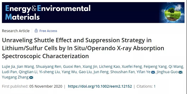 Lujie Jia, Jian Wang, Shuaiyang Ren, Guoxi Ren, Xiang Jin, Licheng Kao, Xuefei Feng, Feipeng Yang, Qi Wang, Ludi Pan, Qingtian Li, Yi-sheng Liu, Yang Wu, Gao Liu, Jun Feng, Shoushan Fan, Yifan Ye, Jinghua Guo, Yuegang Zhang*.Unraveling Shuttle Effect and Suppression Strategy in Lithium/Sulfur Cells by In Situ/Operando X-ray Absorption Spectroscopic Characterization. Energy Environ. Mater. 2021, 4, 222-228.