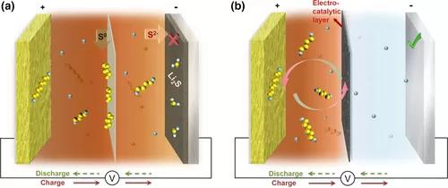 在原始Li/S电池循环过程中,聚硫化物首先吸附在裸隔板上,然后自发转化为S0留在阴极侧;迁移的S物种通过隔板与金属锂快速反应,形成绝缘的硫化锂(Li2S),阻碍了电池运行中的电荷转移.在优化后的Li/S电池中,与阴极隔离的聚硫化物被电催化层捕获,由于该层在组装电池中与阴极有物理接触,吸收的聚聚硫化物可以进一步催化转化为低水平的聚硫化物,这促进了活性材料的利用。在隔膜上引入电催化层,可阻止多极性锂离子向阳极侧迁移,使锂/硫电池阳极健康,硫利用率高。