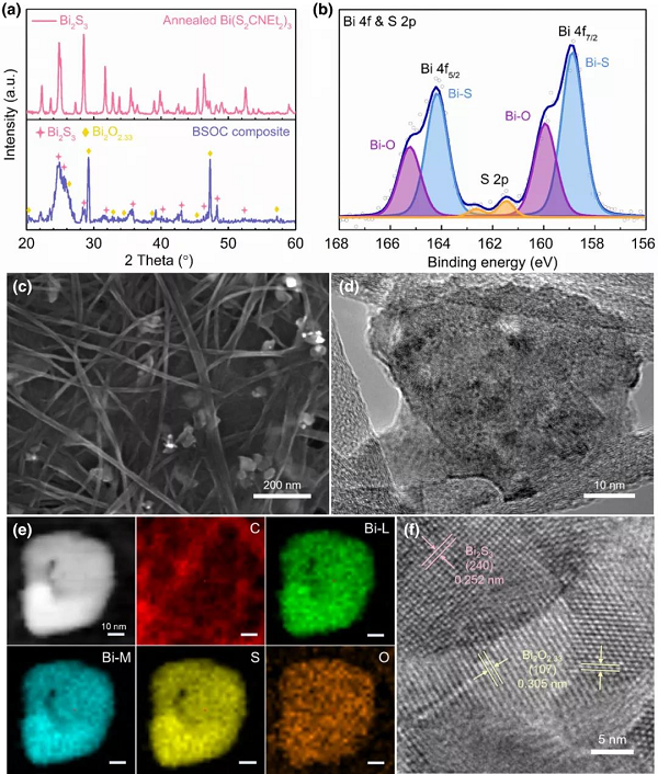 图2. 制备的BSOC纳米复合材料的化学结构和形貌表征。a)退火后Bi(S2CN(C2H5)2)3前驱体(上)和BSOC复合材料(下)的XRD谱图, b) BSOC复合材料的Bi 4f和S 2p XPS谱。c) BSOC层的SEM图像。d) TEM图像,e)杂化BSO种子碳结构的EDX图。f) BSO纳米团簇的高分辨率TEM图像。