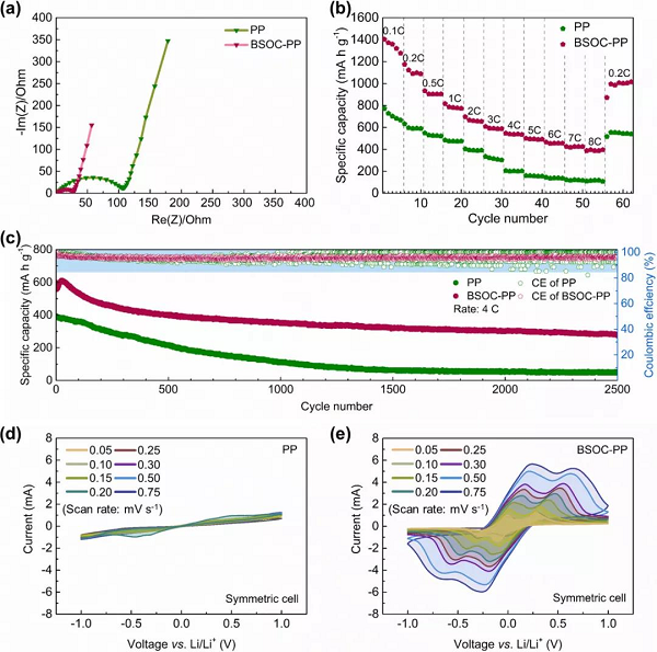 采用原始商用PP或BSOC-改性PP (BSOC-PP)组装Li/S电池,评价其催化功能。两种Li/S电池的电化学阻抗谱(EIS)显示,引入BSOC层后,电荷转移电阻显著降低(29 vs 112 Ohm),表明电荷转移动力学迅速。这可能是由于BSOC层优化了电极电解质界面,从而促进了快速电荷转移过程。值得注意的是,BSOC修饰的电池表现出更好的硫物种利用,在CV曲线上表现出更高的电流密度和更大的面积。此外,BSOC层修饰的硫阴极在各种速率下提供更高的容量。在较高电流速率下(≥4 C), BSOC层的引入促进了电荷转移和高硫物种转化动力学。这种改造策略显著提高了电池在≥4 C高速率下的长期稳定性,达到了599 mA h g-1的高初始容量和极低的衰变率(0.022%),2500的寿命。重要的是,在BSOC修饰的电池中,库仑效率稳定地高于97%,证明了更好的转换可逆性和限制了多硫化物在电池周期中的穿梭。分别使用BSOC-PP和PP组装的对称电池和聚硫电解质进一步测试催化效果。BSOC修饰对称电池的EIS显示出明显加速的电荷转移过程,与原始对称电池相比,Rct显著缩小,原始对称电池在CV谱图中几乎没有Li2S6的氧化还原电流(图3d),这意味着使用纯PP对聚硫没有催化作用。与此形成鲜明对比的是,BSOC修饰的对称电池在不同扫描速率下均有明显的氧化还原峰(图3e),表明S8 ⇌ S6-2 ⇌ Li2S是可逆反应。这些电化学结果为BSOC层对多硫化物的固定和催化转化提供了证据。