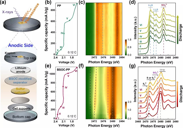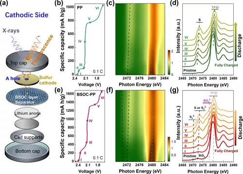 图4. 在有/没有BSOC层的Li/S电池阳极侧的原位/操作S k边缘XAS观察。a)原位/操作XAS研究中,用于AEI观测的硬币电池设计示意图。b)原始Li/S电池在0.12 C下使用纯PP进行操作XAS测量时的初始放电电压。c)原位/操作S K-edge XAS图,d)带有PP的Li/S电池在第一次放电过程中,在不同电势下的XAS光谱。e)在执行操作XAS测量时,BSOC修饰的Li/S电池在0.12 C的初始放电电压。f)原位/操作S K-edge XAS图,g)带有BSOC-PP的Li/S电池在第一次放电过程中,在不同电势下的XAS光谱。