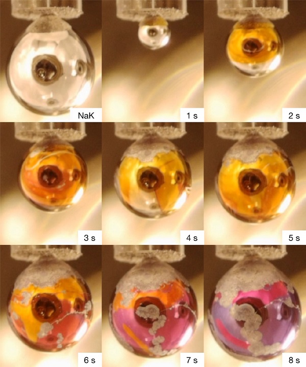 图一、真空中的纯NaK滴和暴露在水蒸气中的NaK滴的时间演变