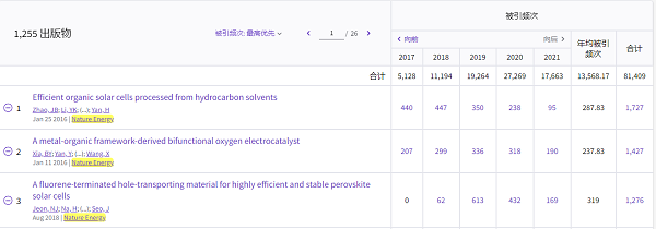 小结:Joule每年的发文量在250篇左右,每年被引用总量逐年增加,2020年总被引达到16633次。期刊发表的文章类型则以论文和社论材料为主,排名前三的发文单位是美国能源部、中国科学院和麻省理工学院,高产作者包括Sutherland BR、Cui Y和Malik R。截止统计前,被引次数最多的是Zou Yingping 2019年发表的“Single-Junction Organic Solar Cell with over 15% Efficiency Using Fused-Ring Acceptor with Electron-Deficient Core”,已经被引用1740次。