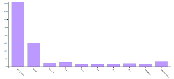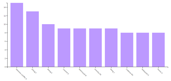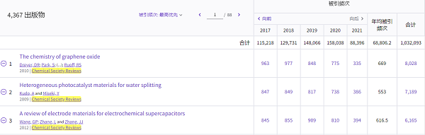 小结:Chemical Society Reviews每年的发文量在300篇左右,每年被引用总量逐年增加,2020年总被引达到158391次。期刊发表的文章类型则以综述论文为主,排名前三的发文单位是中科院、法国国家科学研究中心和加州大学系统,高产作者包括Yoon J、Kim JS和Zhang H。截止统计前,被引次数最多的是Bielawski, Christopher W.和Ruoff, Rodney S. 2010年发表的“The chemistry of graphene oxide”,已经被引用8053次。
