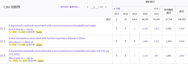 小结:Nature每年的发文量在3000篇左右,每年被引用总量逐年增加,2020年总被引达到66444次。期刊发表的文章类型则以社论材料、论文为主,排名前三的发文单位是加州大学系统、哈佛大学和霍华德·休斯医学研究所,高产作者包括Tollefson J、Ledford H和Witze A。截止统计前,被引次数最多的是Shi, Zheng-Li 2020年发表的“A pneumonia outbreak associated with a new coronavirus of probable bat origin”,已经被引用4769次。