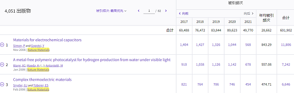 小结:Nature Materials每年的发文量在300篇左右,每年被引用总量逐年增加,2020年总被引达到89943次。期刊发表的文章类型则以论文为主,排名前三的发文单位是加州大学系统、美国能源部和法国国家科学研究中心,高产作者包括Ball P、Pamies P和Taniguchi T。截止统计前,被引次数最多的是Simon, Patrice 和Gogotsi Yury 2008年发表的“Materials for electrochemical capacitors”,已经被引用11830次。