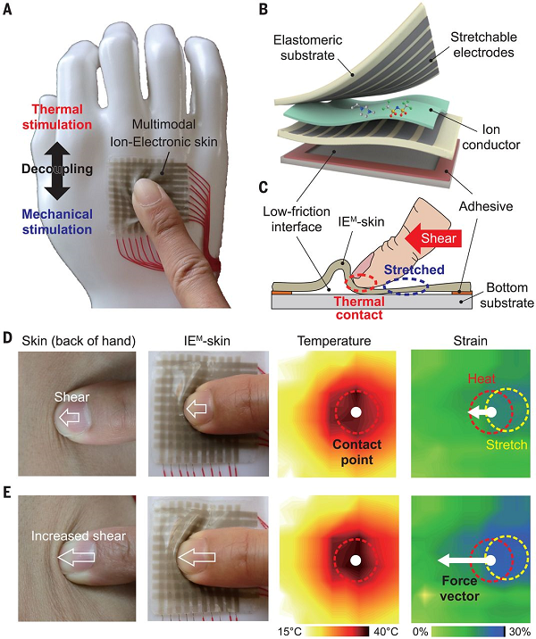 图1多模态离子电子皮肤的结构及其对应力和温度的响应
